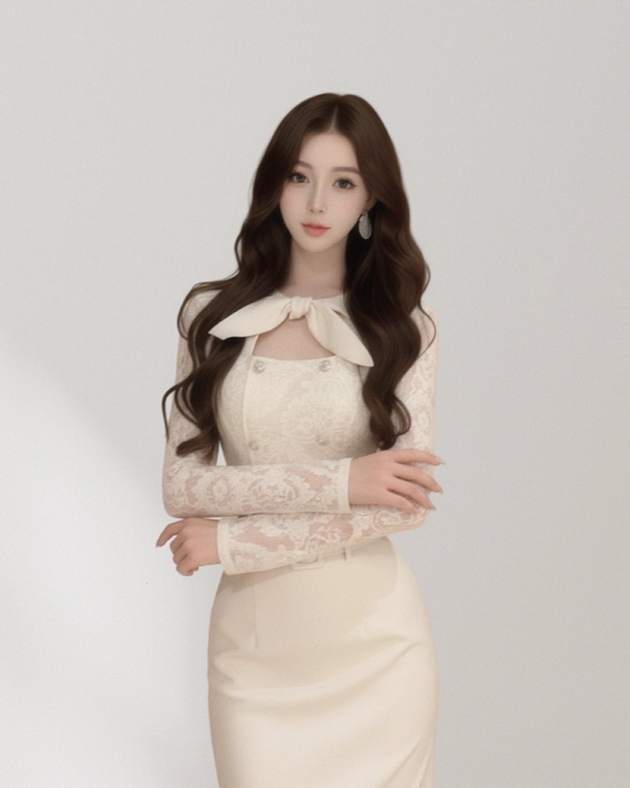 ふんわりと透けるレースと胸元のリボンが印象的な一枚。